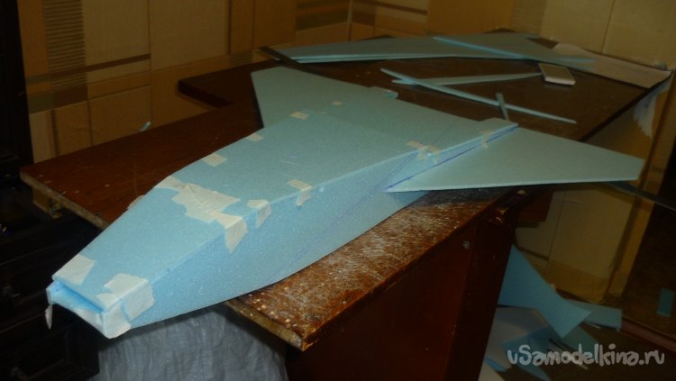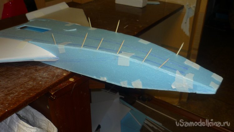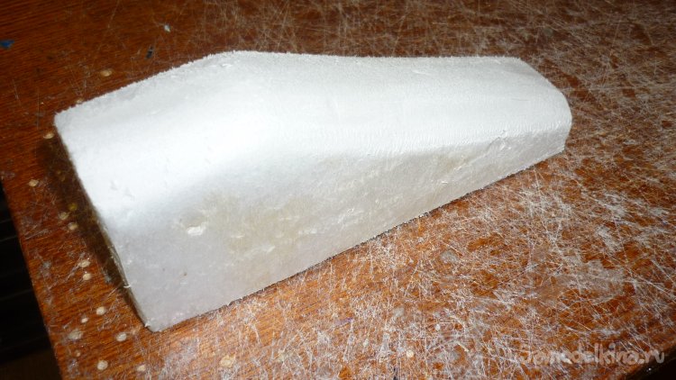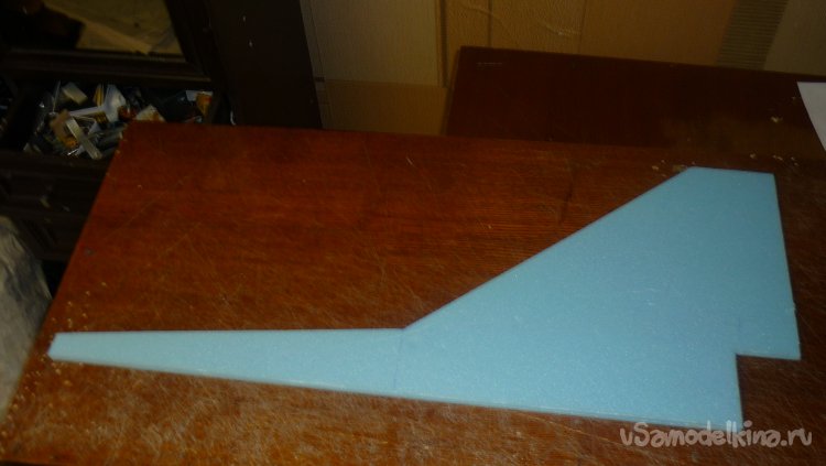 Из утеплителя, тлщиной 40 мм. вырезал заготовку стойки для мотора с винтом.