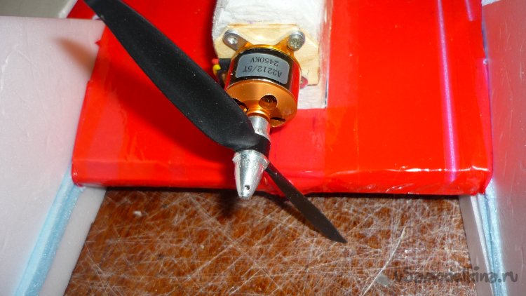 На стойку приклеил кусок 3 мм. фанеры и установил мотор в винтом.