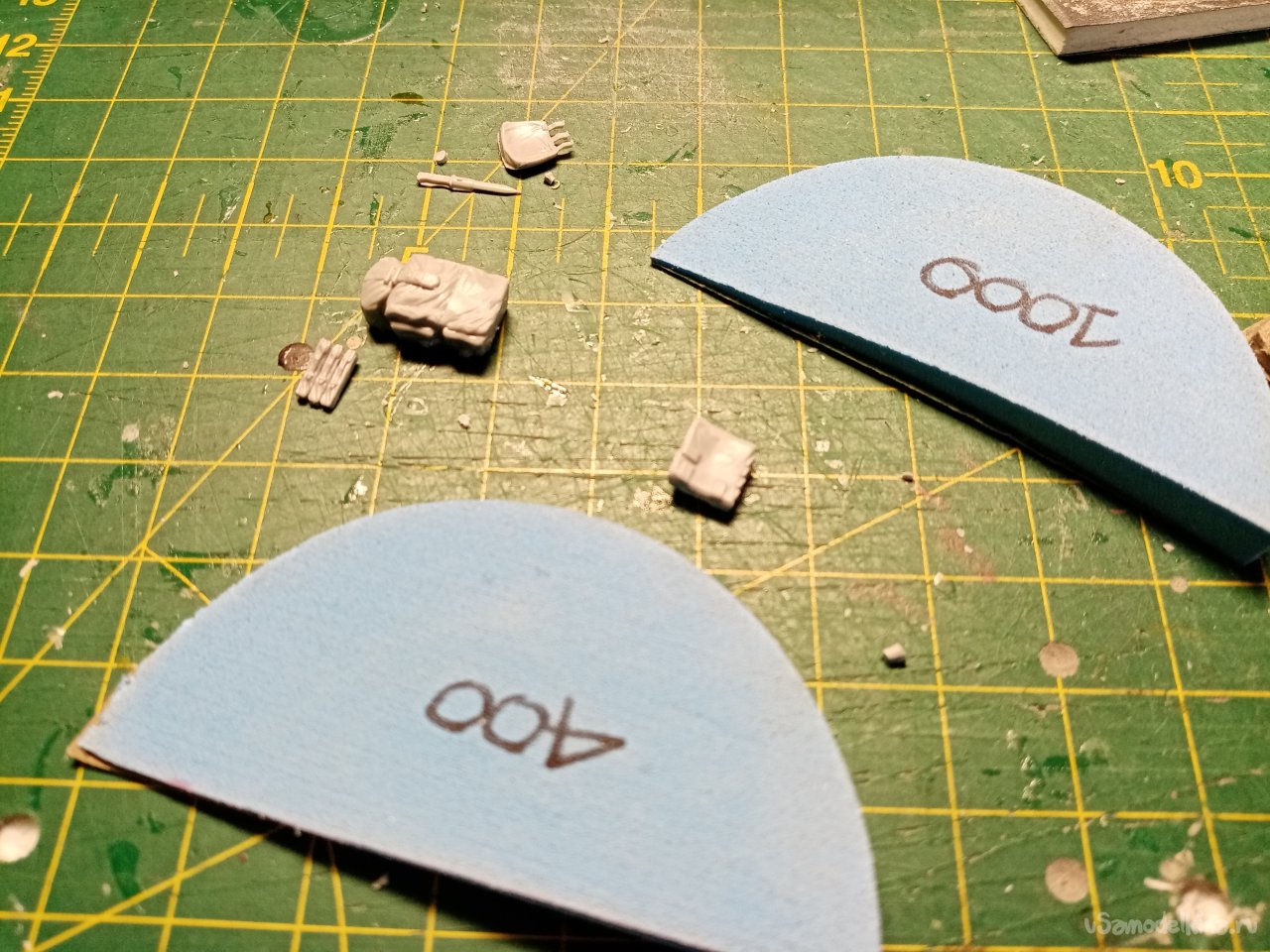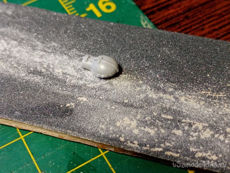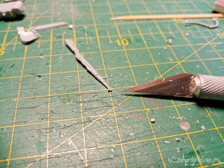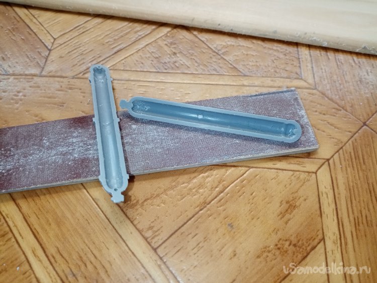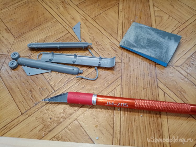 Немного поправляю облой при помощи ножа для творчества с треугольным лезвием и шкуркой наклеенной на вспененную резину. Все подготовлено, можно собирать.