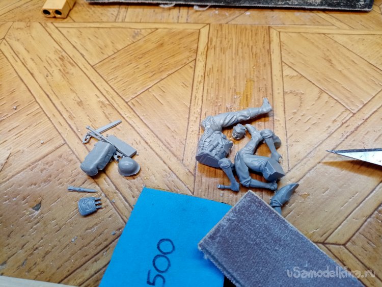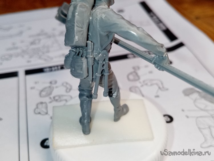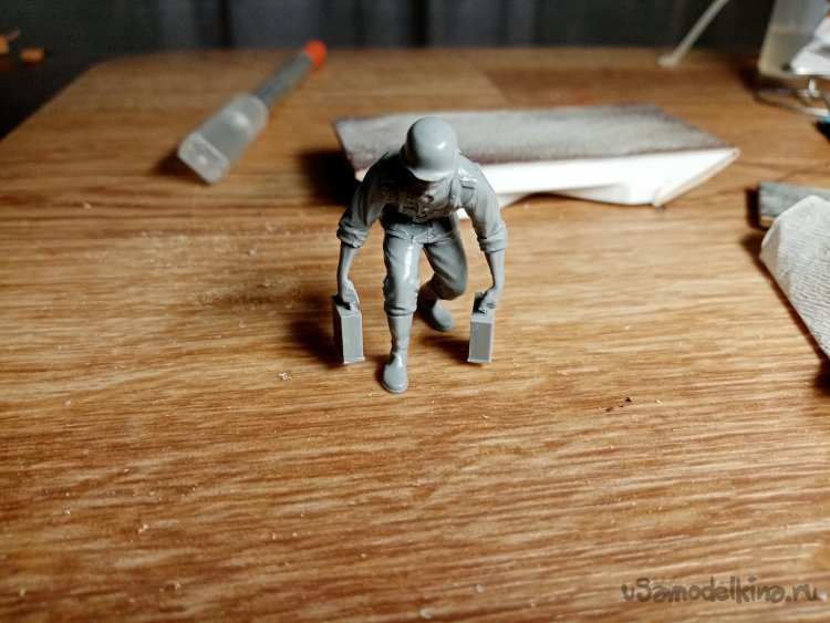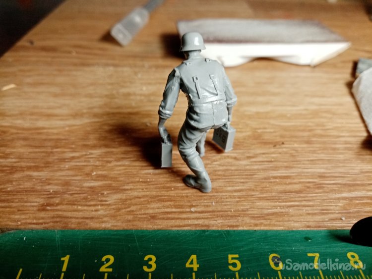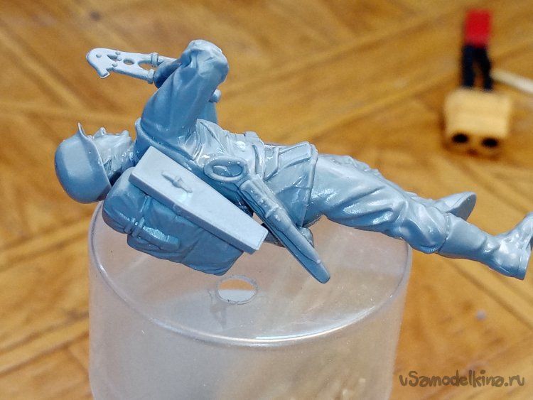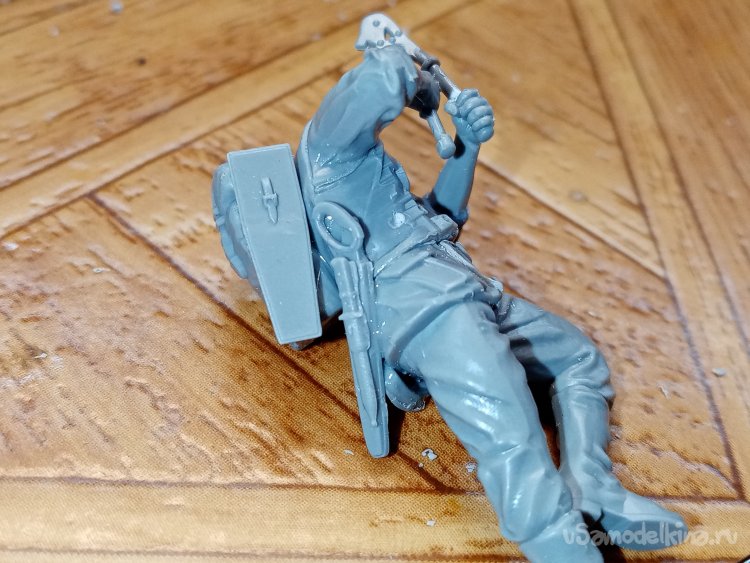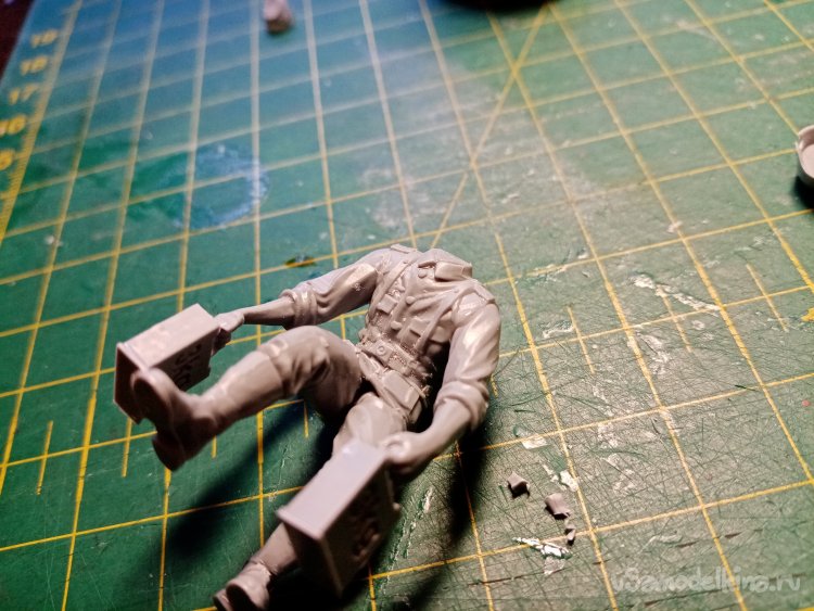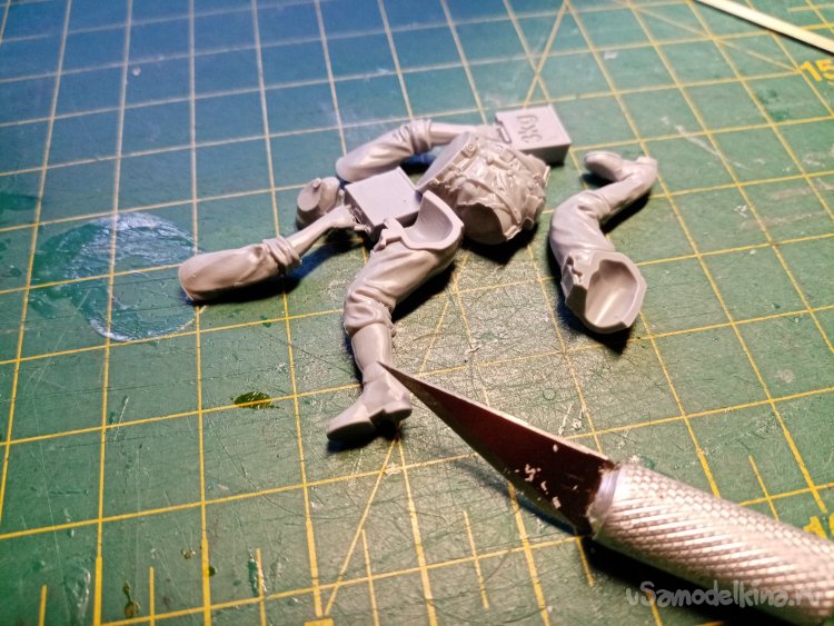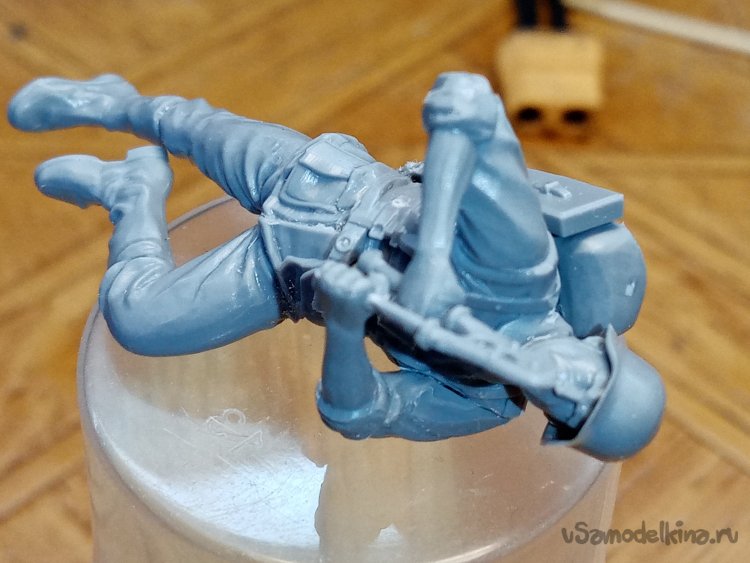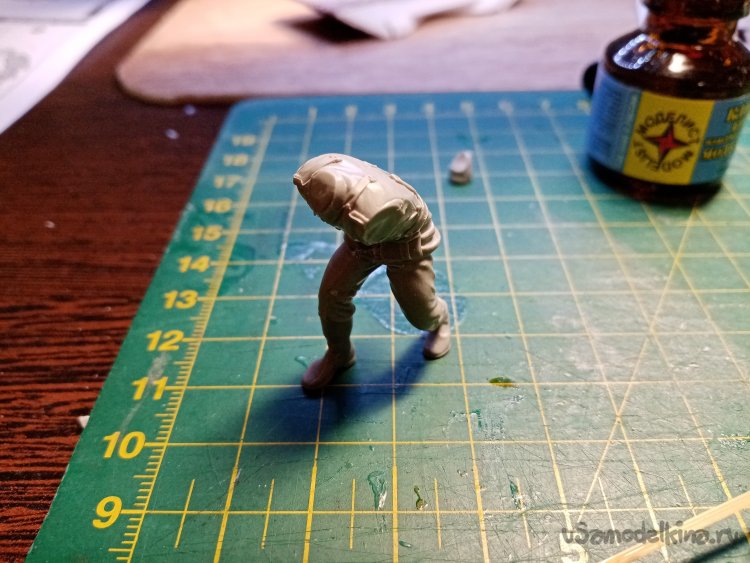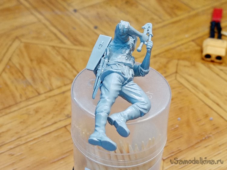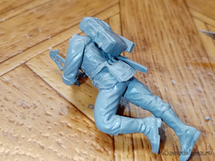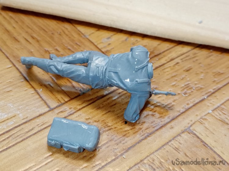 Отделяю детали для напарника огнеметчика. Немного ножом и шкуркой и можно склеивать. Первым собрал баллон, потому что эта фигурка должна согласоваться с «рабочим местом». Собрал ноги. Подшлифовал место соединения с торсом.