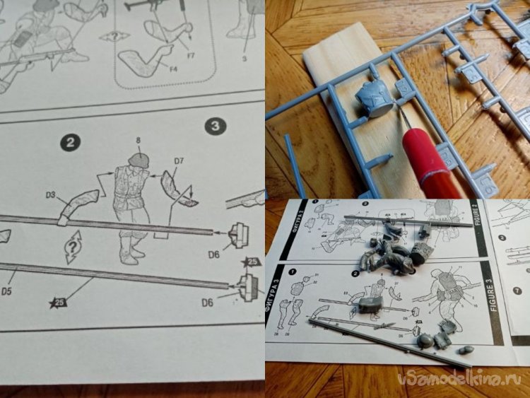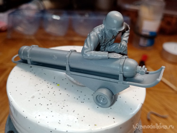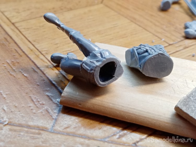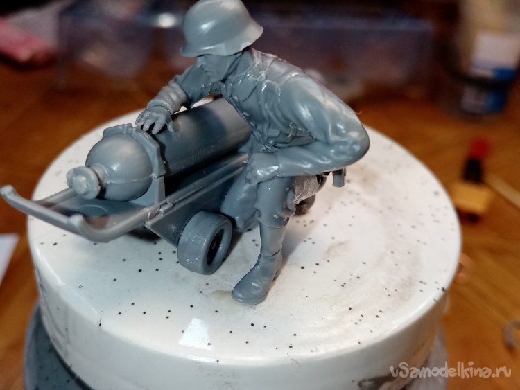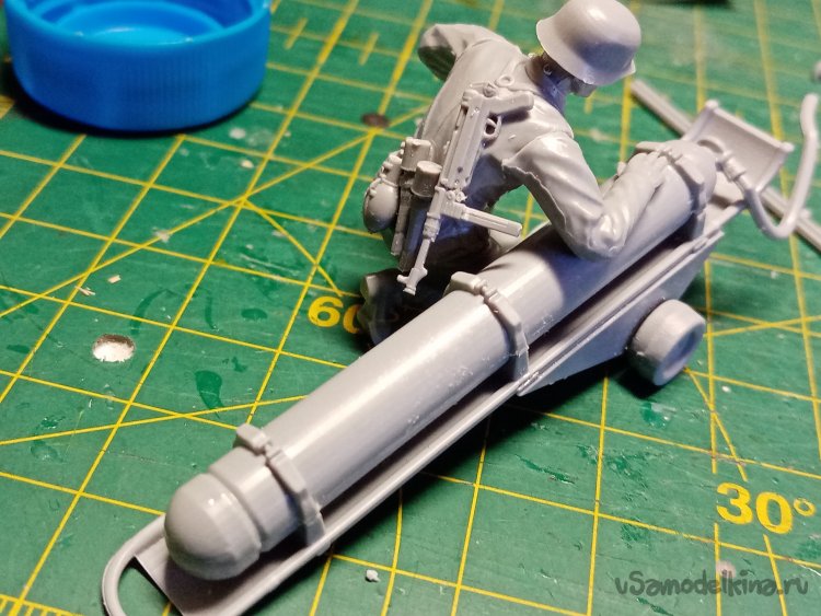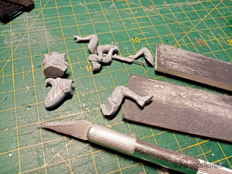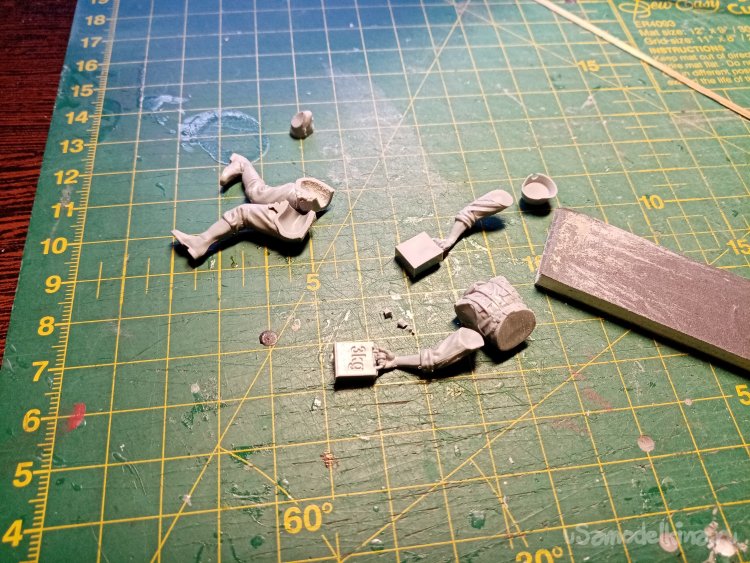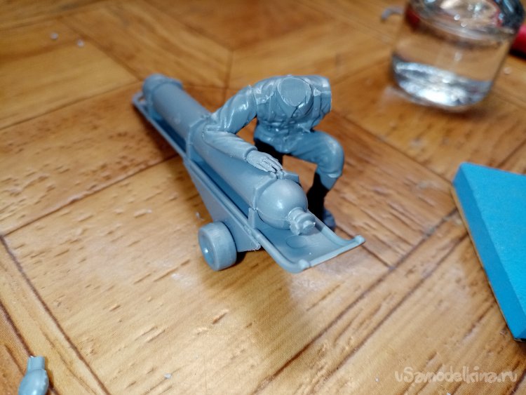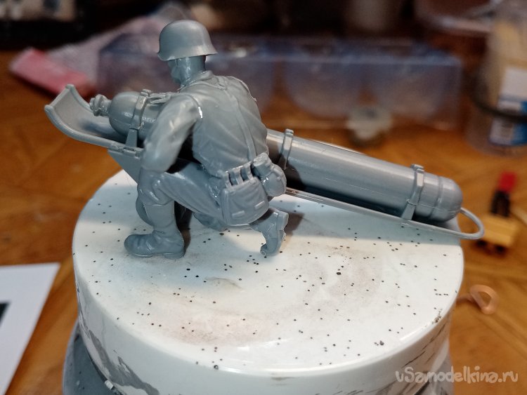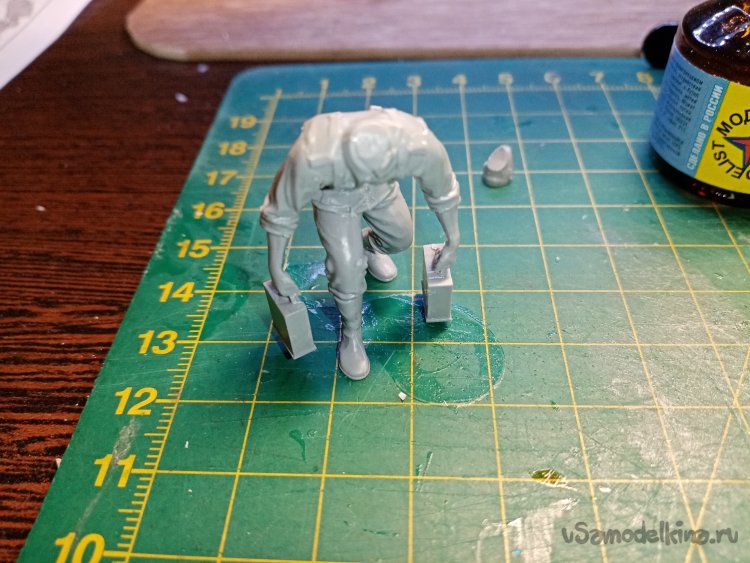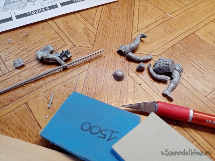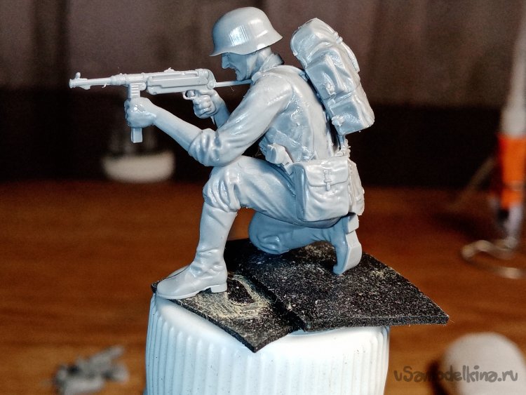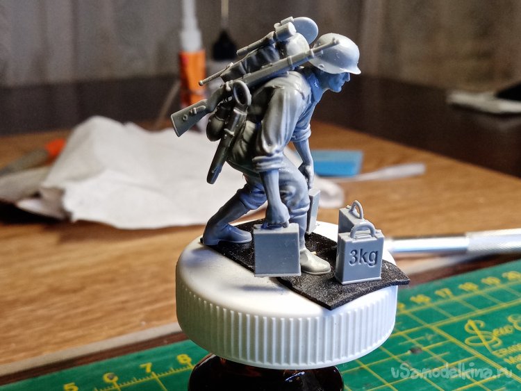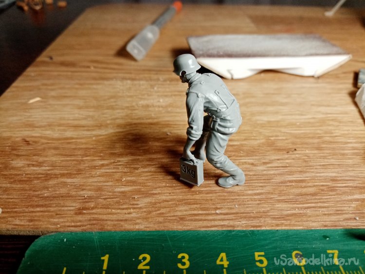 Отделяю детали для напарника огнеметчика. Немного ножом и шкуркой и можно склеивать. Первым собрал баллон, потому что эта фигурка должна согласоваться с «рабочим местом». Собрал ноги. Подшлифовал место соединения с торсом.
