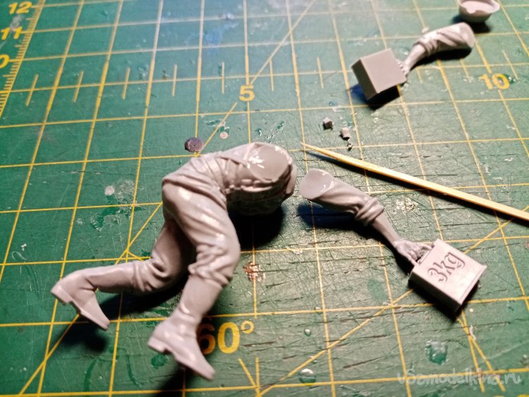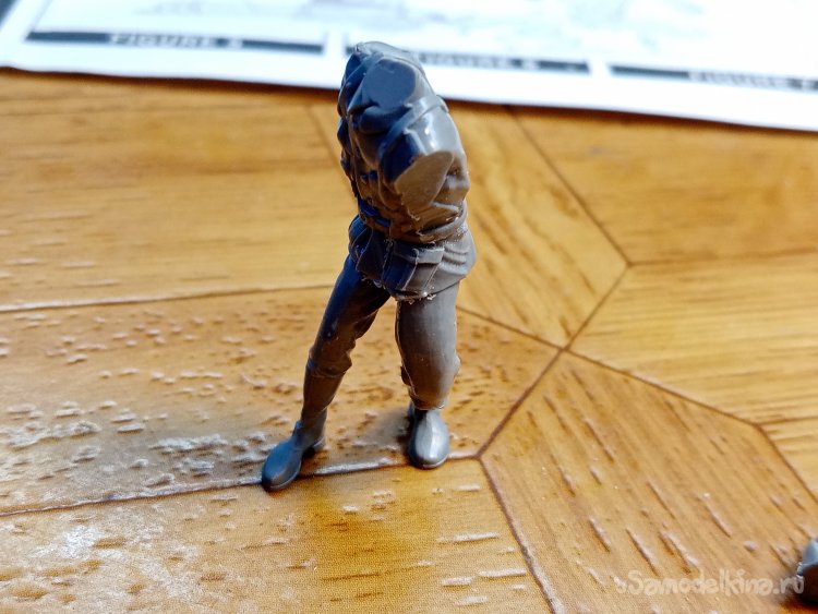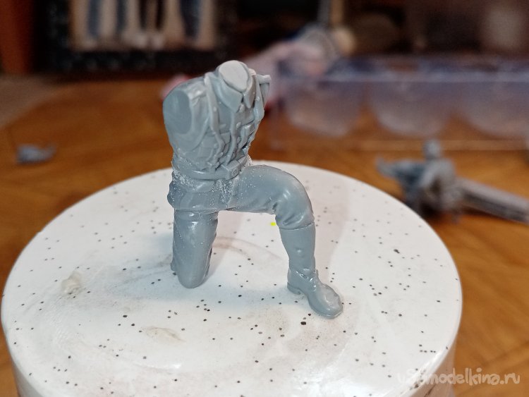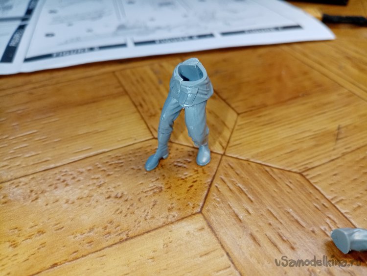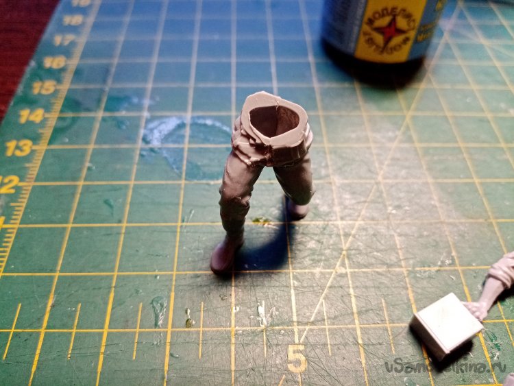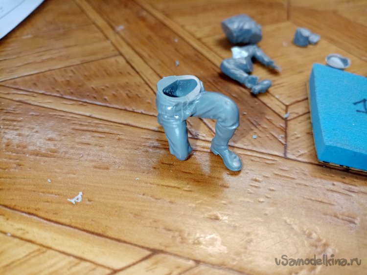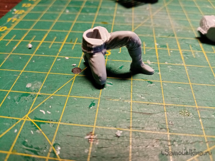 Сейчас начну показывать страшные вещи. Например, идущие штаны с ногами в сапогах. Склейка прошла хорошо. При сборке фигурок использую клей для пластика из набора. После склейки штанов. Немного шлифую площадку соединения с торсом.