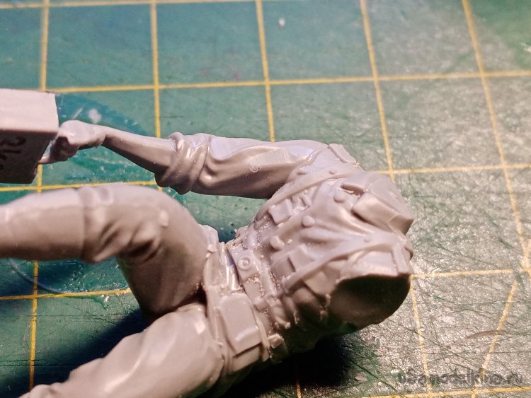 Но из за этого на поясе получился солидный сдвиг деталей. Встал вопрос, подгонять и шпаклевать или так оставить. Решил ничего не менять. Сдвиг закрою «навесным» оборудованием. На фигурке навешано не мало.