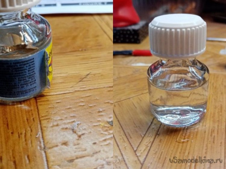 С бутылочки клея снял бумажку. Так более четко видно как опускается палочка в раствор. Поэтому советую покупать прозрачные флакончики.