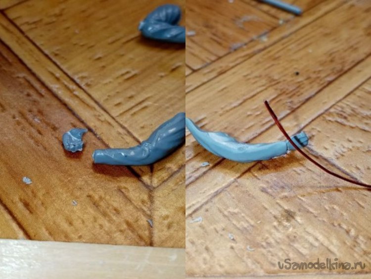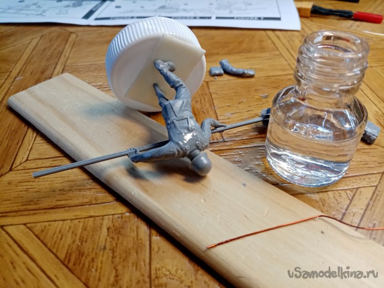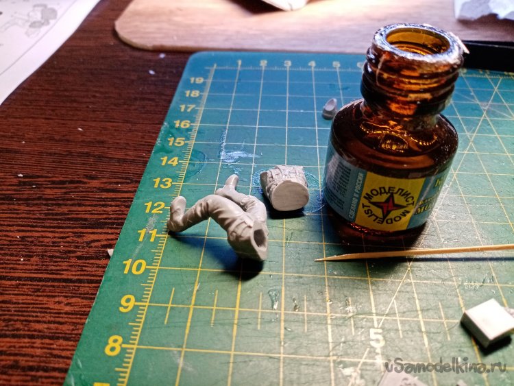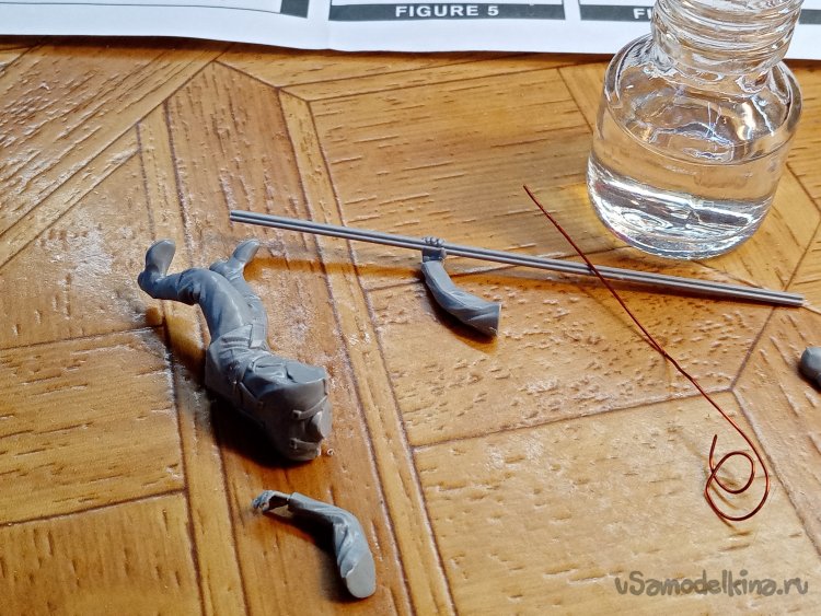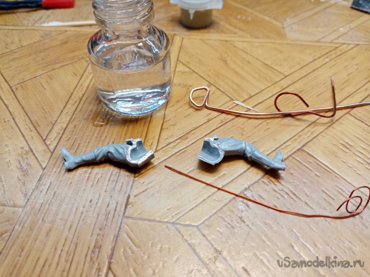 Затем трудная операция. Нужно соединить руки с торсом и шестом для мины. Тонкой проволочкой наношу солидные капли клея на места соединения.
