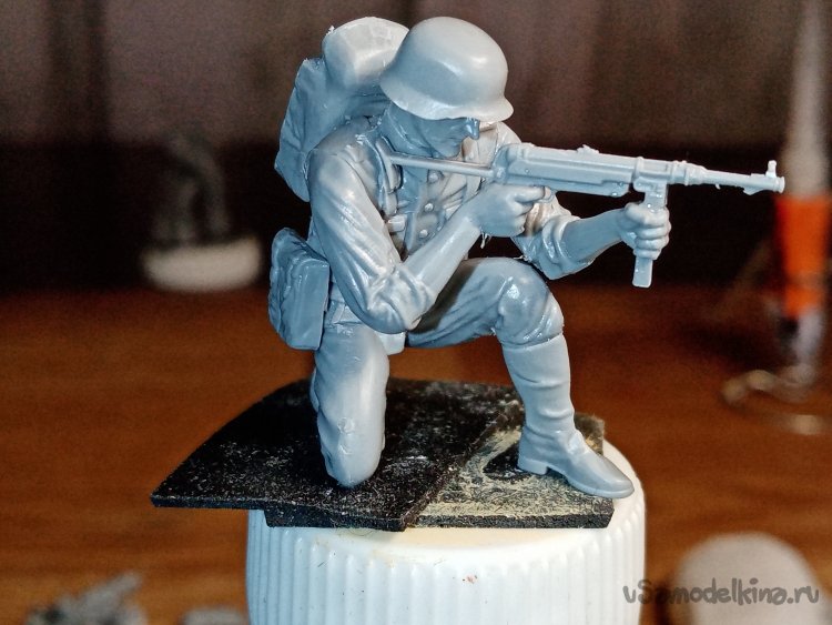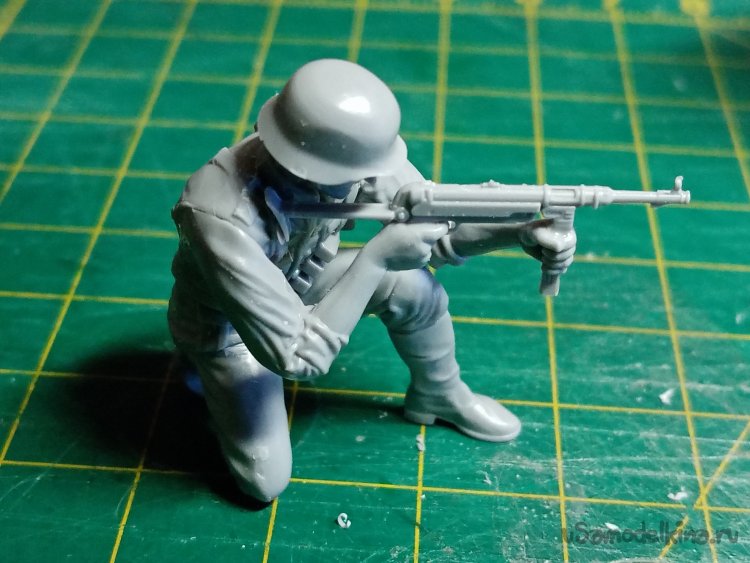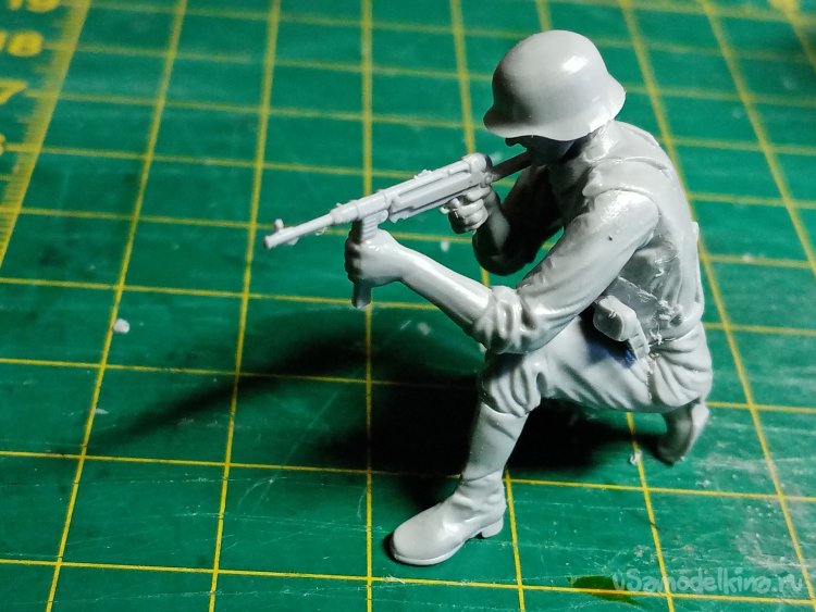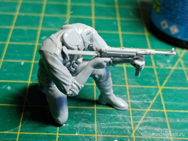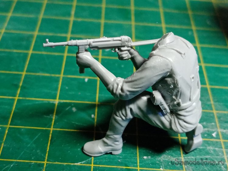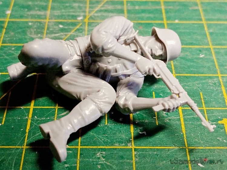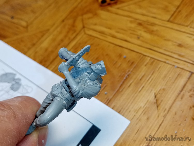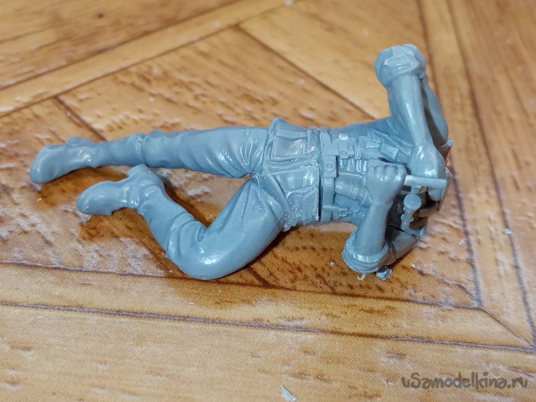 С этими руками небольшая заминка. Кисти отдельно придется приклеивать. Положение сложное, держать автомат, рука на спусковом крючке и вторая на магазине, нужно, чтобы голова была на одной линии прицеливания.