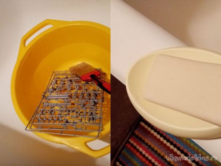 Промываю рамки в горячей воде с хозяйственным мылом. В нем мало жира и хорошо отъедает грязь. Из предосторожности мою пластик мягким флейцем в тазике. На литниках много мелких деталей, можно потерять.