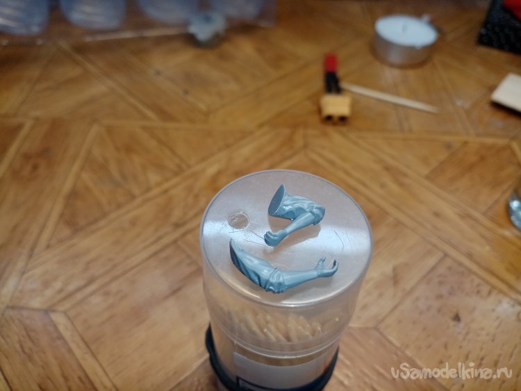 Сложная поза дала о себе знать неудачно подходят ноги к торсу. Если соединить как полагается. Не лежит фигурка с приподнятыми руками. Наношу клей на соединение ног с торсом. Жду размягчения пластика, намного подвигав скрепленные детальки, придаю более естественную позу.