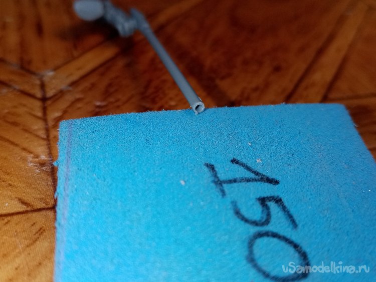 Для реализма прокрутил кончиком лезвия треугольного ножа отверстие в трубе. К стати прием вполне нормальный. Не нужно подбирать диаметр сверла. Острый кончик хорошо врезается в пластик. Таким образом, делал отверстия в стволе винтовок и автоматов. Приклеил руки держащие трубу.