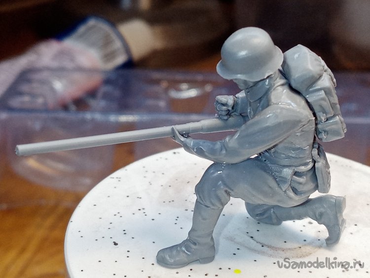 Затем нужно приклеить голову. В таком положении, чтобы фигурка прицелилась из автомата. Наношу клей на торс и шею больше. Выжидаю размягчения пластика. Прикладываю детали и немного смещаю из стороны в сторону. Добиваясь валика на шее. Затем наклоняю голову к автомату на линию прицеливания. На шее не образовалось щели. И хорошо не нужно будет шпаклевать. Валик затем подрежу при полном отвержении пластика. Одеваю каску.