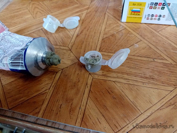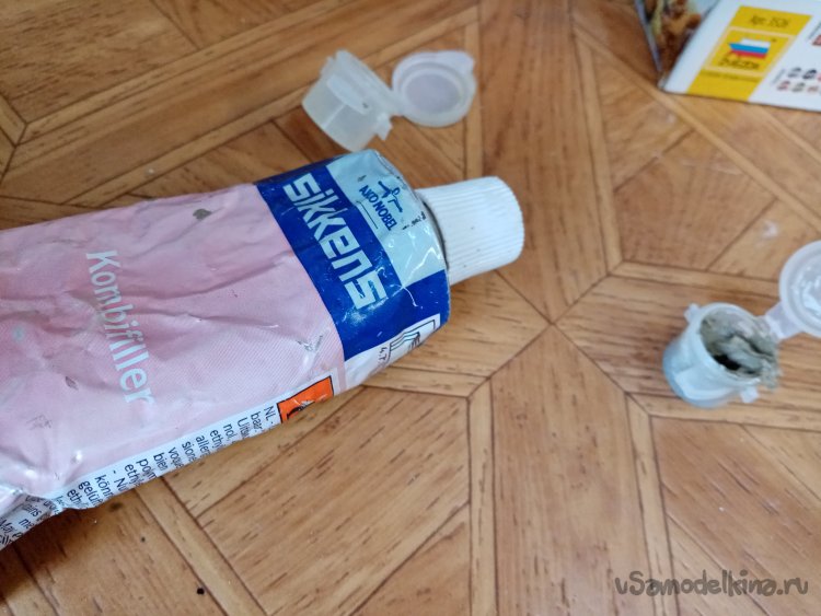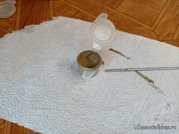 Нужно немного подшпаклевать соединения на фигурках. Для этой цели использую автомобильную шпаклевку по пластику. Хорошо держится. Со временем немного загустела. Выдавливаю немного в пустую баночку от краски.
