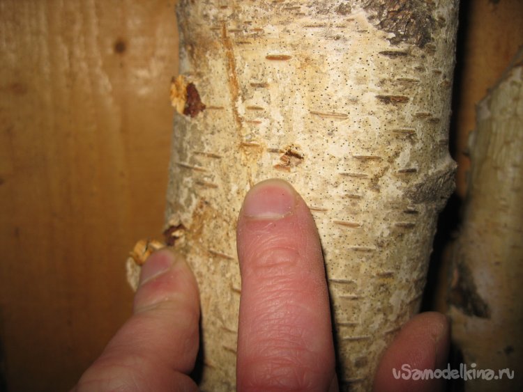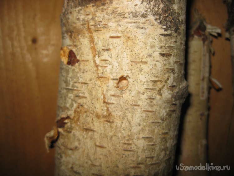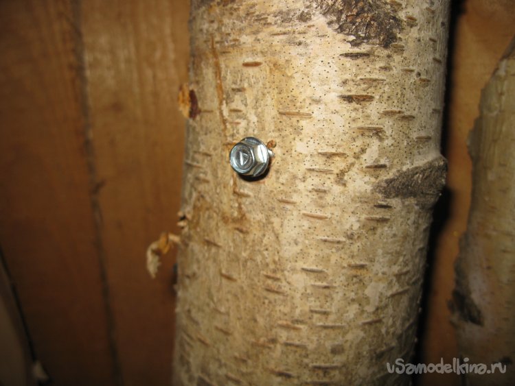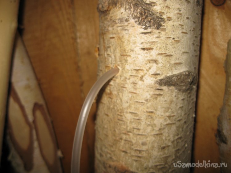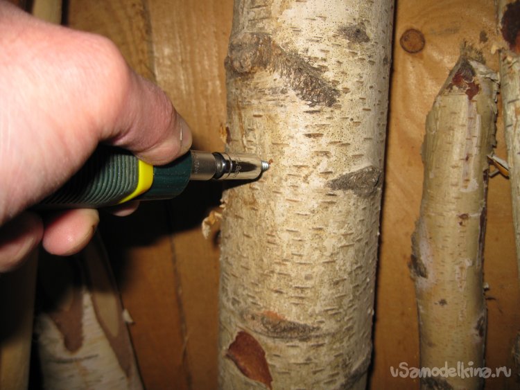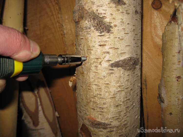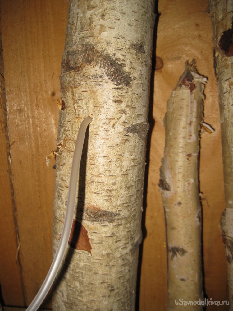 Да, кстати, тут я прошу меня извинить, что в момент съемок фото, я не мог продемонстрировать это на настоящей живой березе, поскольку в тот момент, я находился дома. Поэтому для примера, я показал, как вкручиваю саморез в толстый березовый сук, который стоит у меня в мастерской (его я заготовил еще несколько лет назад для различных самоделок из березы).