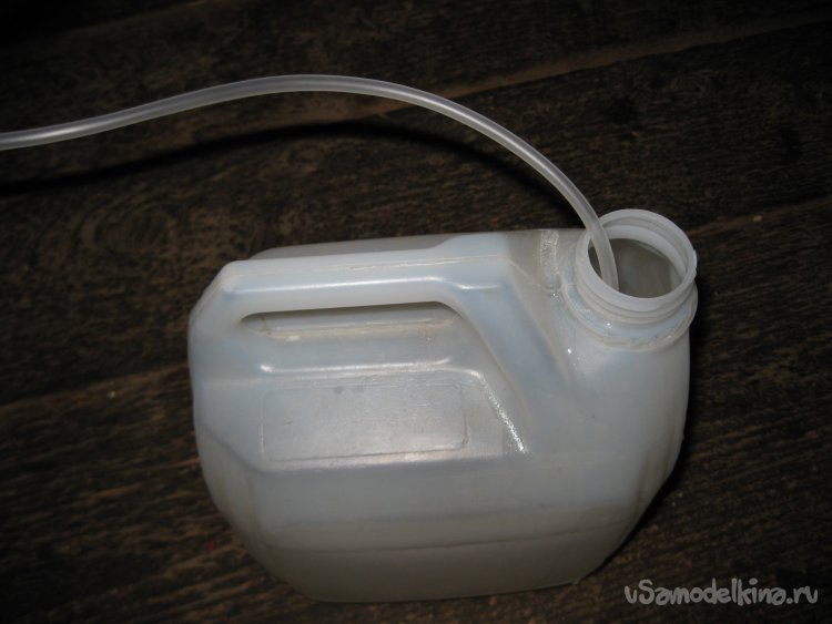 Второй конец трубочки, я помещаю в горлышко пластиковой канистры, которую ставлю под березу.