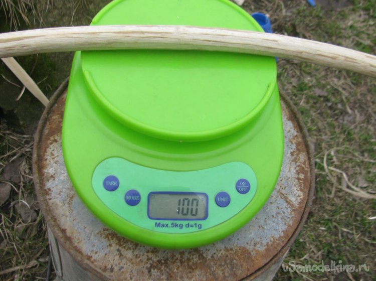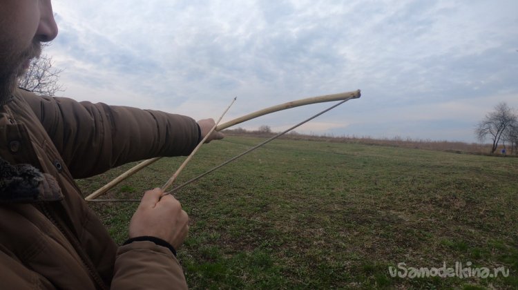 Поставил тетиву из довольно толстой веревки, поскольку тонкая рвалась. В не критическом натяжении лук выдает 6 кг, возможно, он выдержит и 7 кг, но в режиме стрельбы вряд ли понадобится растягивать его до таких значений. Лучше для большей мощности просто подобрать палку потолще, на 3-4 см в диаметре. Также можно поэкспериментировать и с длиной лука, это увеличивает ход стрелы при выстреле, дает больше времени на разгон стрелы.