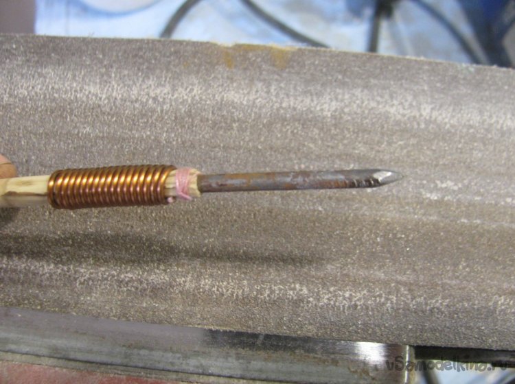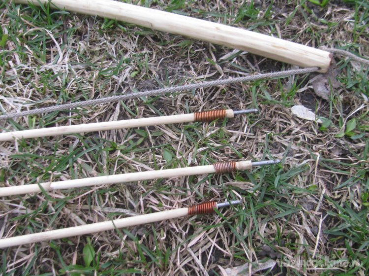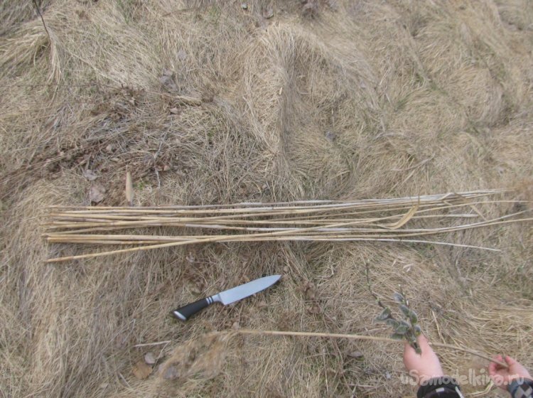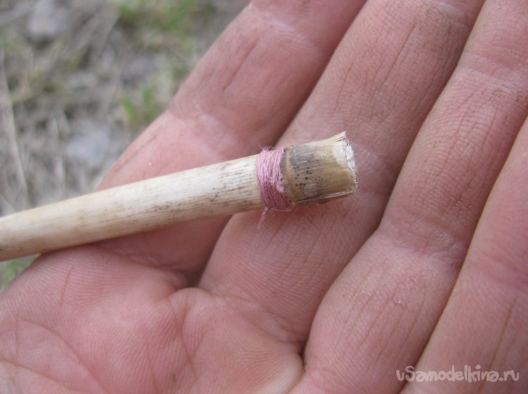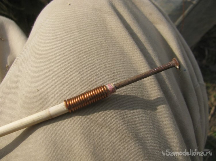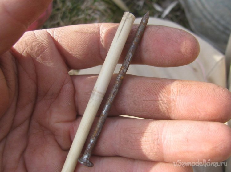 Отрезаем тростник до нужной длины, выбирая максимально ровные части. На обоих концах нужно отрезать на уровнях «суставов», эти соединение увеличивают прочность. Вставляем гвоздь острым концом и наматываем проволоку. В завершении можно срезать шляпку и наточить гвоздь. В целях безопасности можно спрятать гвоздь внутрь, чтобы не торчал и никого не травмировал.