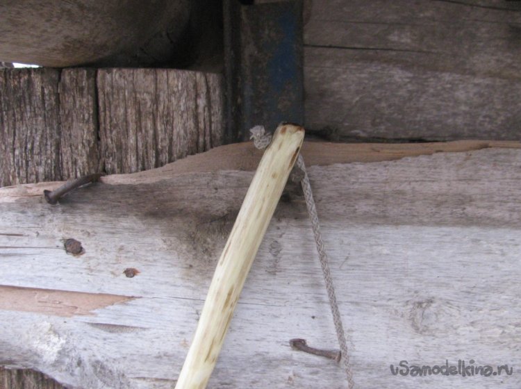 Длина палки была 96 см, я снял с нее кору и потихоньку выгнул на коленке в дугу, натянув веревку. В таком положении лук сох возле печки 3 суток, так делать не рекомендуется, поскольку древесина может потрескаться. В процессе сушки натуральный «клей» в древесине засыхает, а еще дерево становится значительно легче.