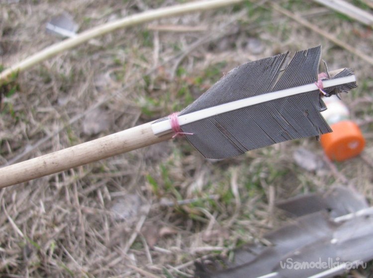 Хвостовую часть нужно укрепить, чтобы ее не рвала тетива, а также не сдавливали пальцы. Для этого вставляем зубочистки или спички, а потом обматываем нитками. Как итог, такая стрела легко выдерживает несколько десятков выстрелов, если не стрелять в твердые предметы.
