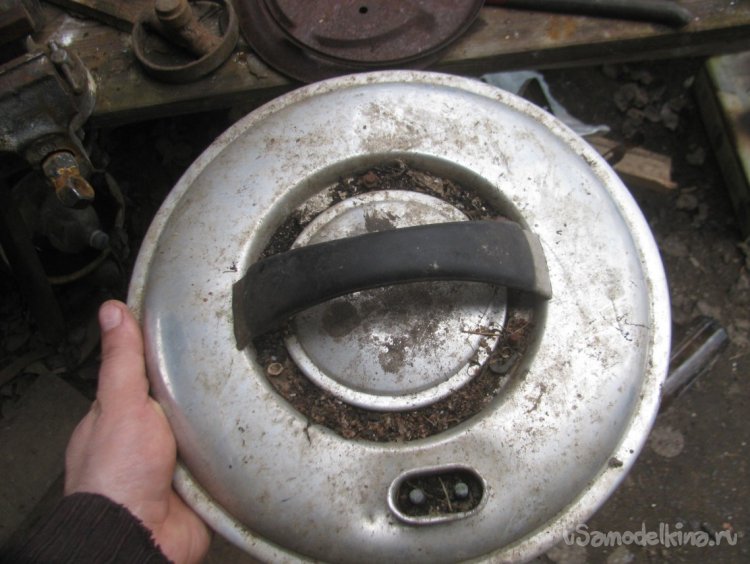Подобрал стальную крышку, а на нее идеально встала крышка от духовки, в итоге между ними появился зазор. Стянул крышки саморезами и засыпал внутрь золы в качестве утеплителя.