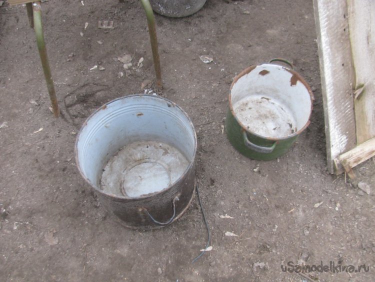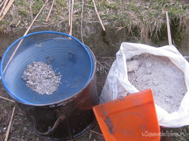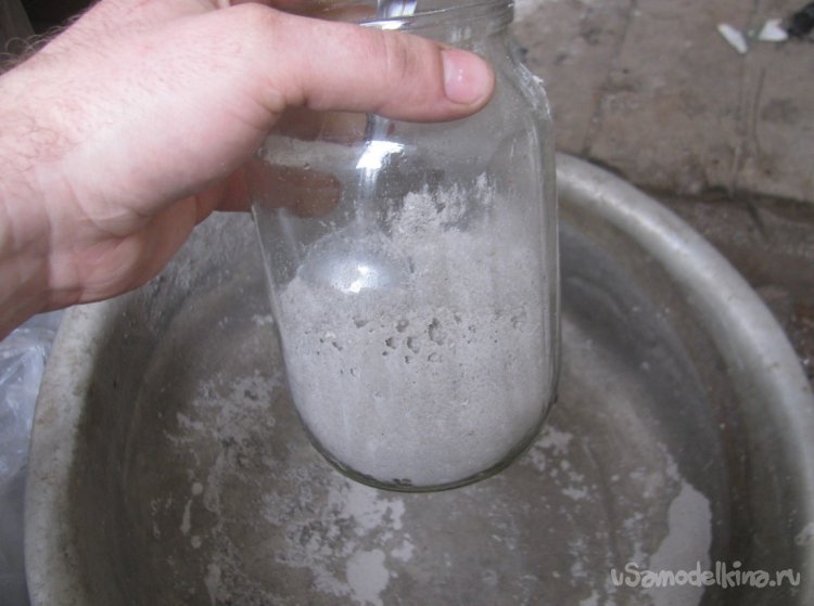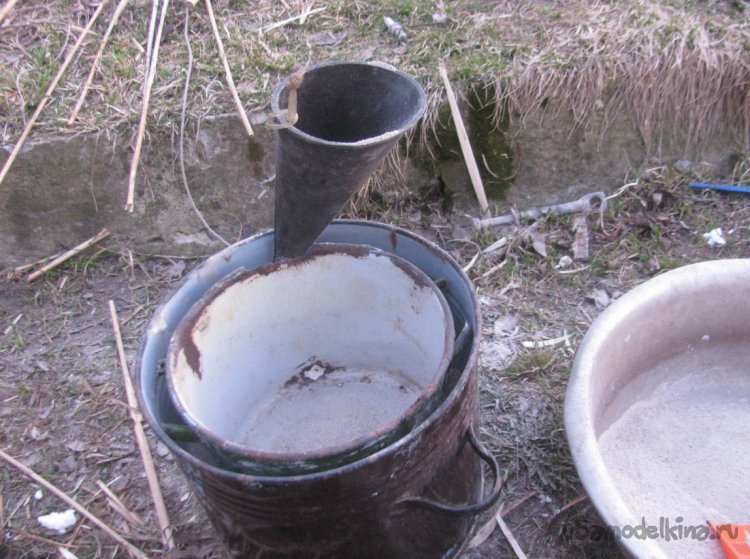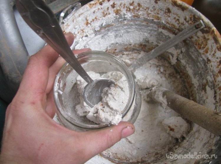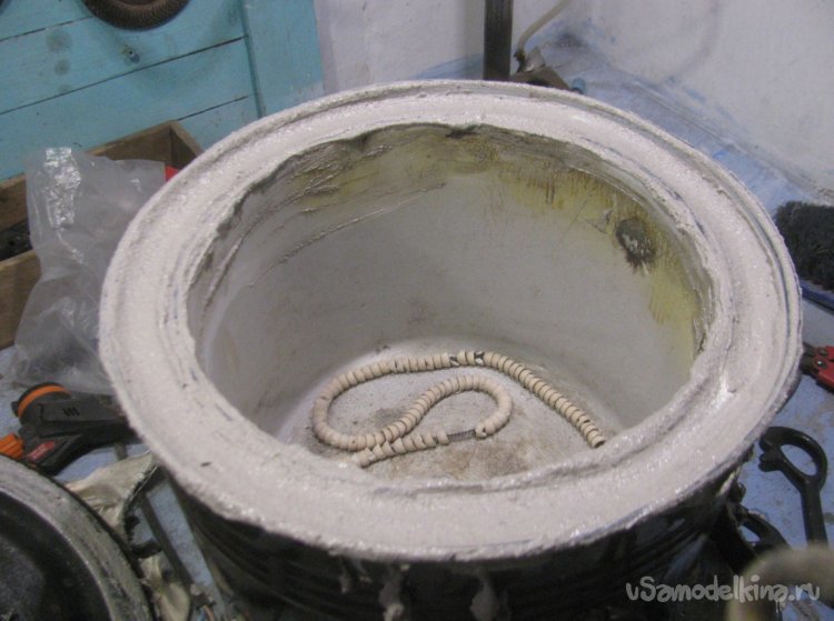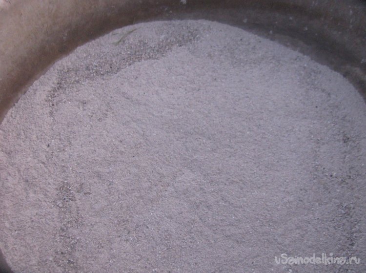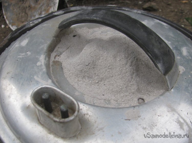 Решил замазать сверху паз, чтобы не летел пепел, да и всю конструкцию это укрепит, поскольку между собой я кастрюли не фиксировал. Нашел в интернете рецепт замазки из золы, извести и соли.