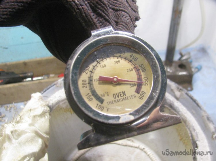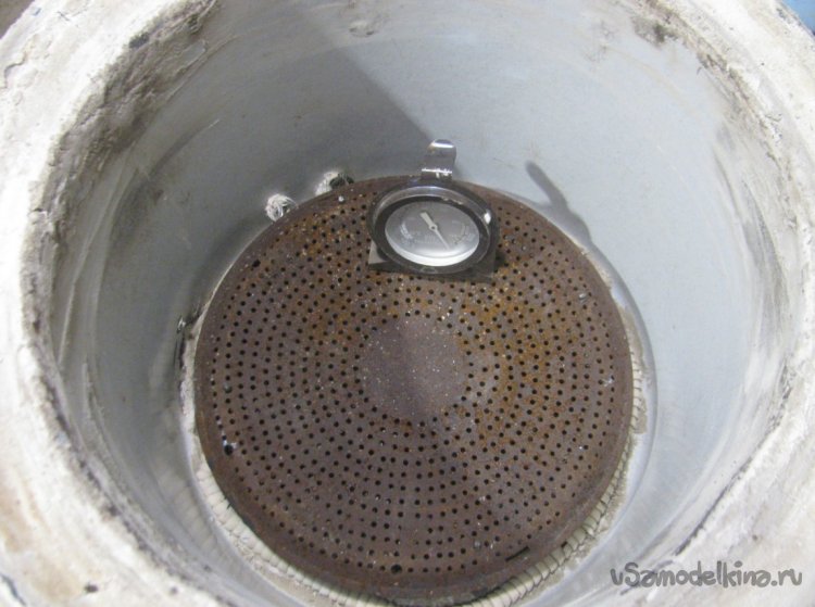 Ну что, засыпал я золы и перешел к первым опытам. Температура внутри с обычной крышкой выросла до 300С, при этом можно держать руку на корпусе печи, хоть она и на грани горячей.