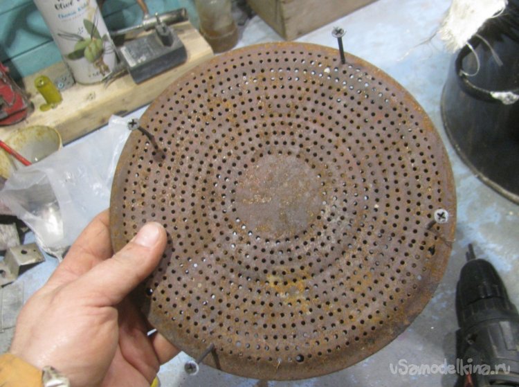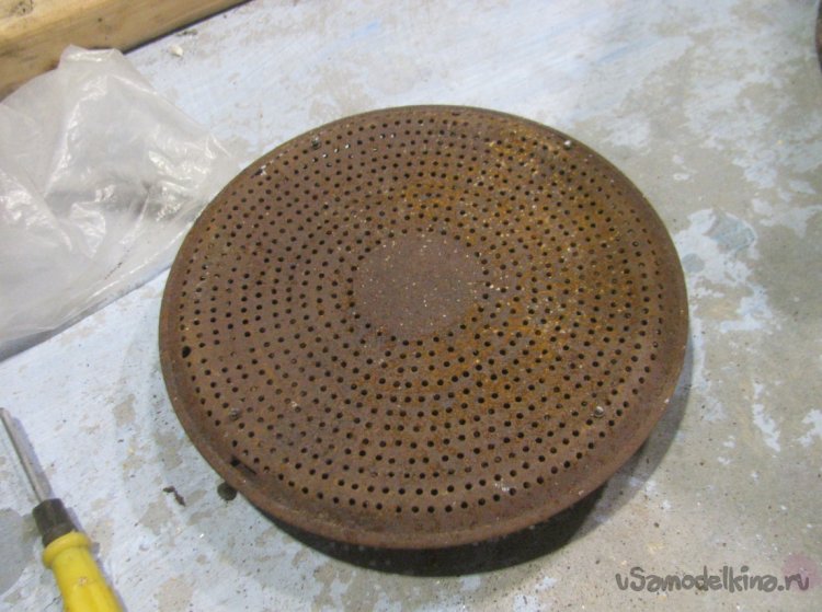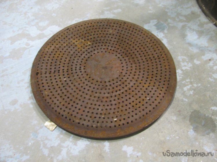 Нашел старый «рассекатель» для газа и прикрутил ножки в виде саморезов. Такой столик отлично стоит в печи и на него можно ставить нужные вещи для обработки.