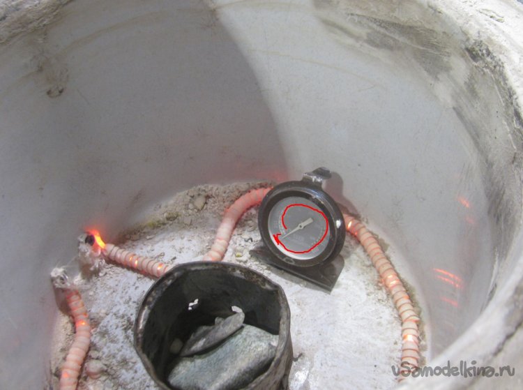 Решил я выжать максимум из своей спиральки, укоротив ее длину. В итоге после всех доработок мой термометр на 300 градусов пошел уже по кругу, там уже не менее 450 градусов Цельсия. Может реальная температура и выше, но алюминий расплавить не удалось, нужна спираль помощнее, из более толстой проволоки.
