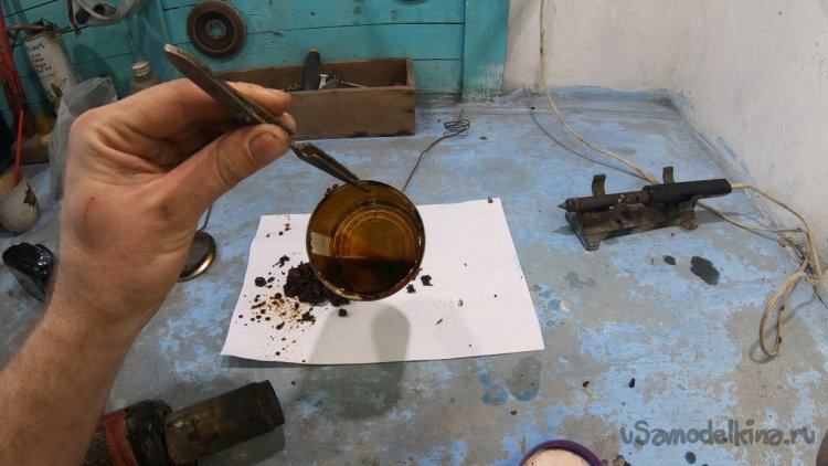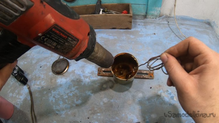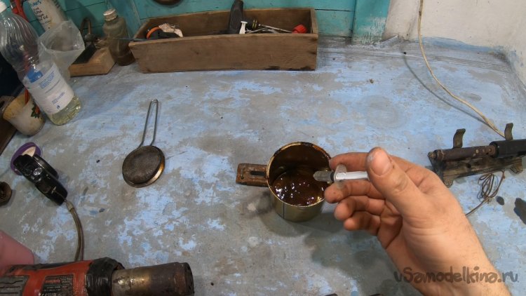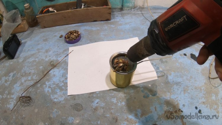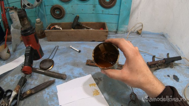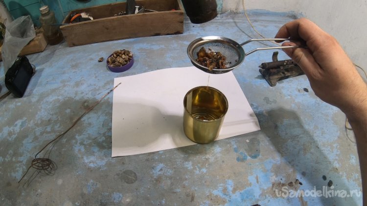 Смолу, которую я наковырял на соснах, содержала много мусора в виде коры, так что нам нужно ее процедить. Для этого использовал маленькое сито и строительный фен. Смола при нагреве превращается в жидкое вещество и легко проходит через сито. Временами можно помешивать смесь для лучшего отделения смолы.