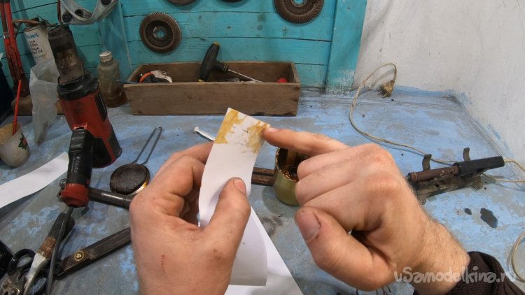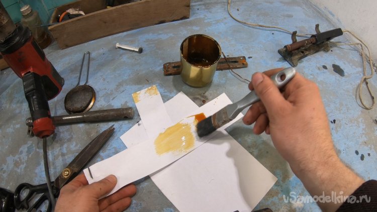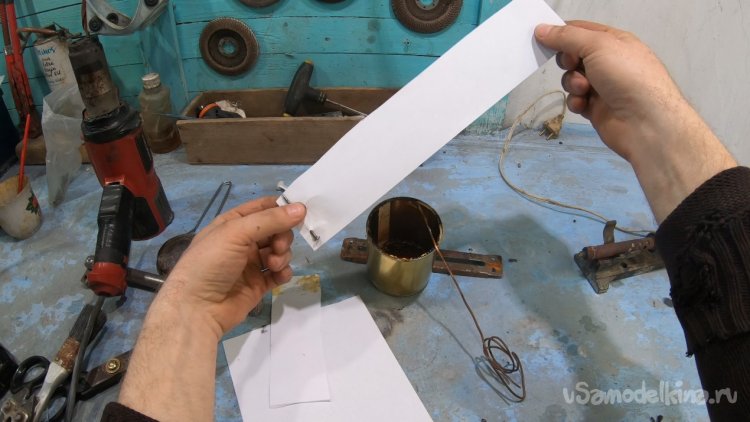 Далее я нарезал полоску из бумаги и прикрепил гвоздик в качестве грузика. Наносим клей кистью, клей можно немного подогреть, чтобы он проще наносился. Внизу можно оставить немного места на всякий случай, чтобы там собирался стекающий клей, который может нагреться на солнце. Но у меня клей вроде держится нормально и не сползает.