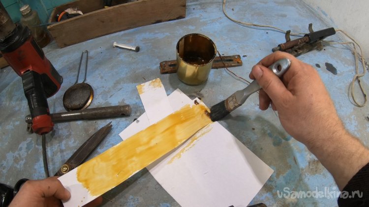 Далее нам нужно добавить в смолу масло, оно не позволит смоле застывать. Чем больше масла, тем жиже будет клей, тут все нужно проверять опытным путем. Тестировать готовый клей лучше на бумаге. У меня все вышло со второго раза. Клей должен выйти очень липкий и тягучий при комнатной температуре.