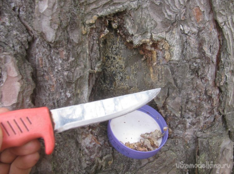 Рецепт предусматривает использование канифоли, но у меня ее не нашлось, так что я отправился в лес и набрал сосновой смолы. В былые времена у нас сосновую смолу добывали довольно активно, у нее есть масса полезных применений.