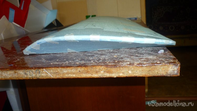 На бумажный, малярный скотч навешиваю руль направления. Перед навеской срезаю под углом переднюю кромку.