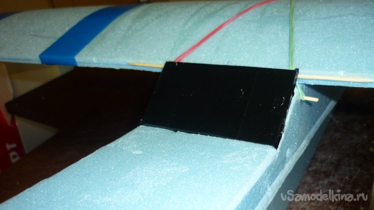 Навесил руль высоты с помощью малярного, бумажного скотча. Перед навеской срезал переднюю кромку руля высоты под уголм.