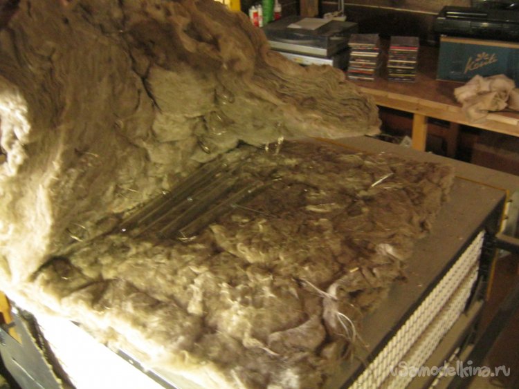 Фото 2. Стеганое базальтовое одеяло. Недорогой и распространенный не специальный огнеупор из строительного магазина. Обычно применяется в строительстве как несколько более дорогой но и более пожаростойкий и экологичный вариант утеплителя. Мой кусок уже побывал утеплением печной трубы. Существуют и другие базальтовые теплоизоляторы – картон, фольгированные маты. Все их можно применять в данном случае. Стекло в такое одеяло закладываю после горелки немедленно, еще светящееся малиновым.