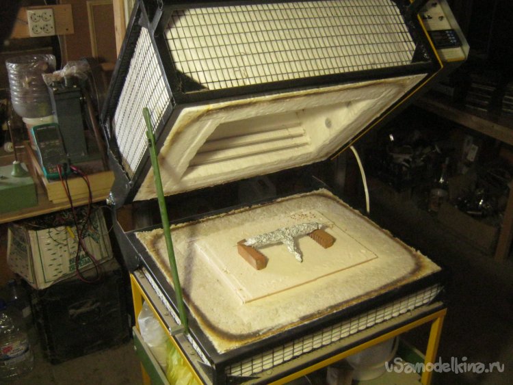 Вариантов печного отжига два – закладывать еще горячую работу после горелки в нагретую печь, выдержать и охладить. Второй – после горелки охлаждать детали так, лишь бы они не растрескались, затем холодные закладывать в печь и делать полный цикл – нагрев-выдержка-охлаждение.