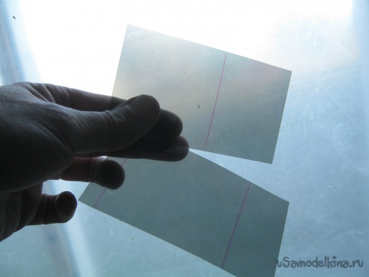 Фото 4. Две поляризующих пленки с Али Экспресс. Запчасти для карманных игр (?). Красные полосы – защитная пленка. Каждая такая пластинка пропускает только определенную часть обычного белого света.