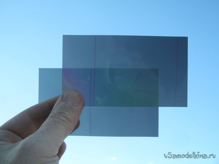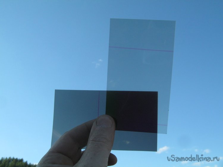 Фото 5. Так, если расположить эти пластинки одну за другой и направить на источник света, то в зависимости от положения второй пластины (ближе к наблюдателю) увидим перехлест почти прозрачным в одном из крайних положений.