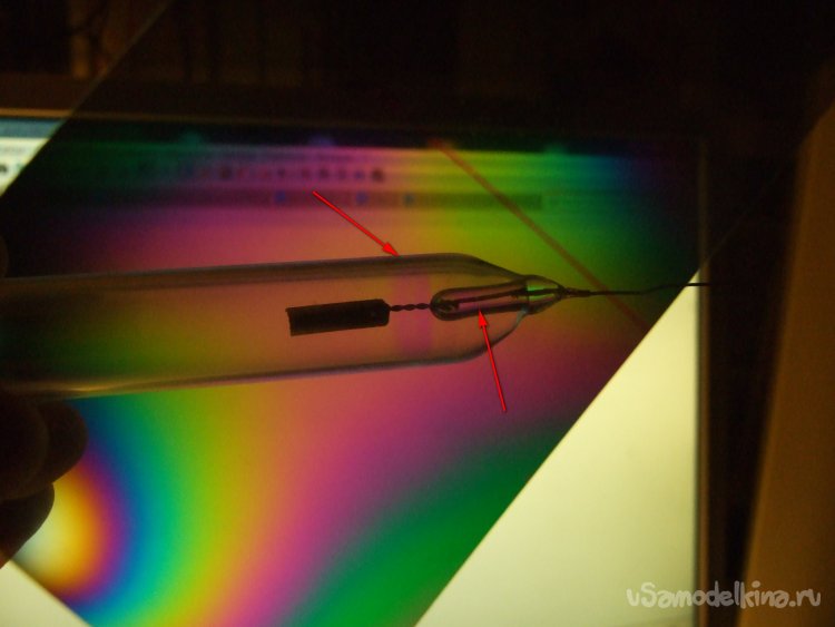 Фото 8. Несколько «перьев» в месте где пришлось запаивать трещину на колбе и около впаивания штенгеля.