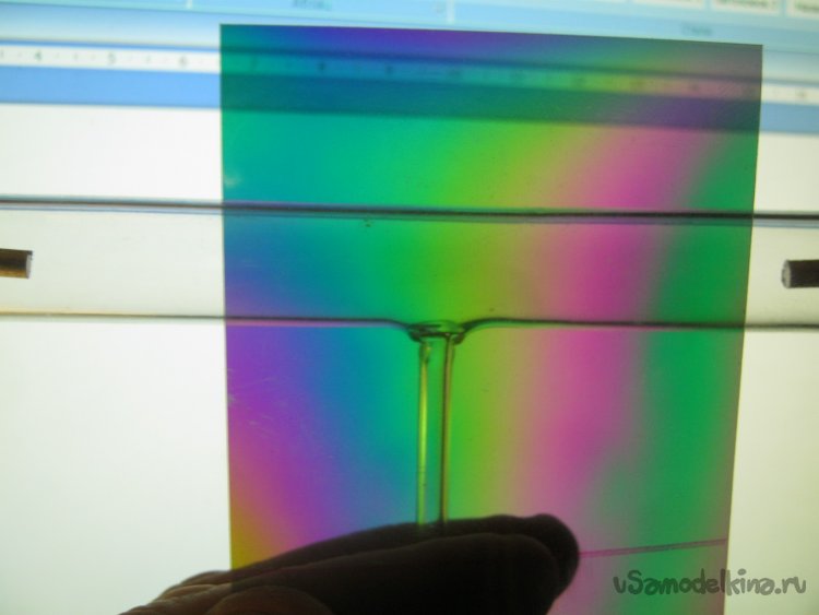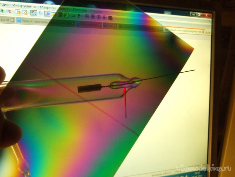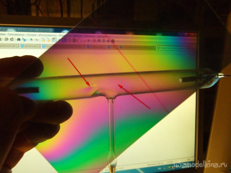 Фото 7. В качестве первой пленки-поляризатора и источника света, можно с успехом применить ЖК монитор с белым фоном – вся это в нем уже есть. Работу помещаем перед экраном, закрываем ее своим поляризатором и крутим его параллельно экрану. На фото – фиолетовые напряжения в месте впая и кольцо около него на колбе.