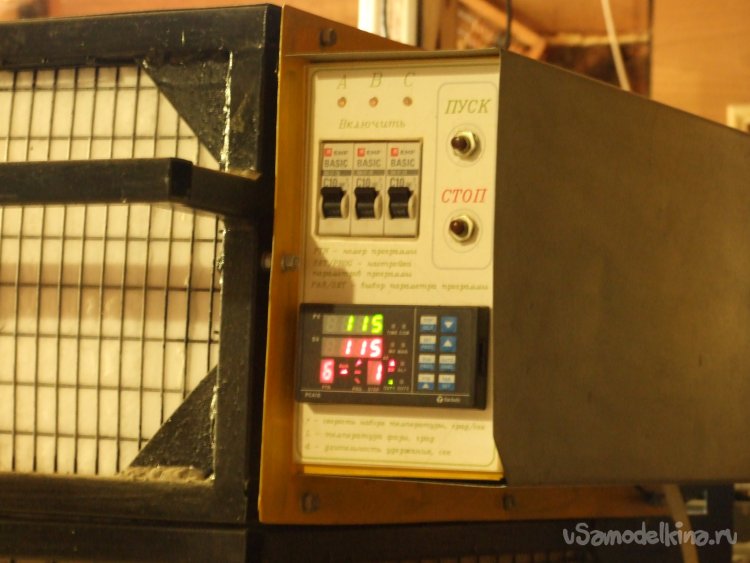 Фото 10. Присматривает за печью термоконтроллер. Здесь применен специализированный китайский для паяльной печи SMD компонентов. Он самостоятельно учитывает темп нагрева при имеющихся нагревателях и теплоизоляции, и очень точно, до градуса, выдерживает температуру не допуская выбега - работать можно около предельных значений. Здесь задал темп нагрева и охлаждения 0,01 град/сек, температуру 550 градусов Цельсия, выдержка – 1 час. Все значения с большим запасом, а темп нагрева-охлаждения, скорее всего на порядок. Весь цикл отжига длился около полутора суток.