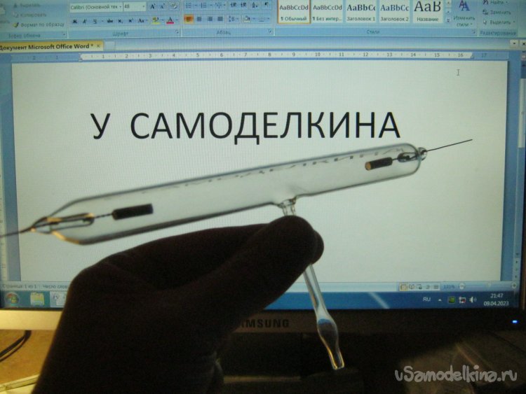 Фото 11. Отожженная трубка. Напряжения на колбе исчезли совершенно, на остекловании проволочных выводов что-то фиолетовое слегка просматривается, но едва заметно. Считаем результат хорошим.