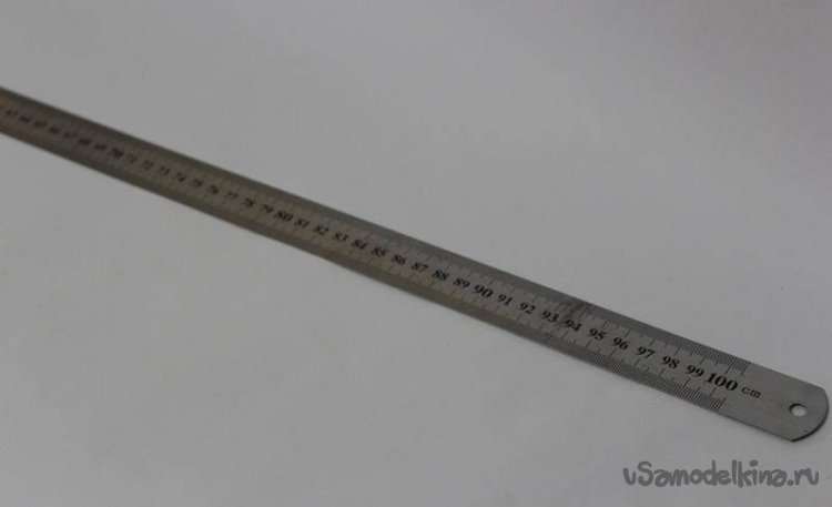 Металлическую линейку длинной в один метр. Удобно резать пластик по линии.