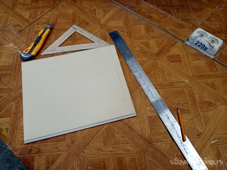При помощи угольника и карандаша размечаю точный угол в 90 градусов на обрезке пластика.