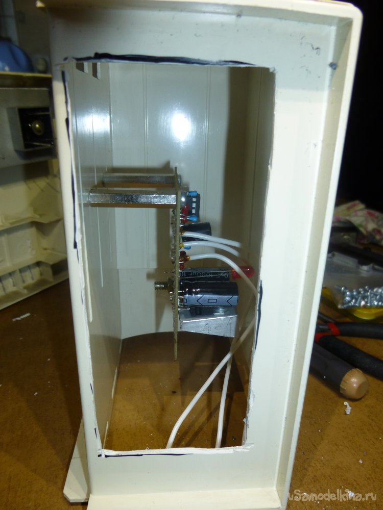 В ответной боковой части (где находится аккумуляторный отсек) выпилил в передней стенке окно, чтобы иметь доступ к передней панели изнутри. Закрепил на стойках внутри аккумуляторного отсека плату ШИМ-регулятора.