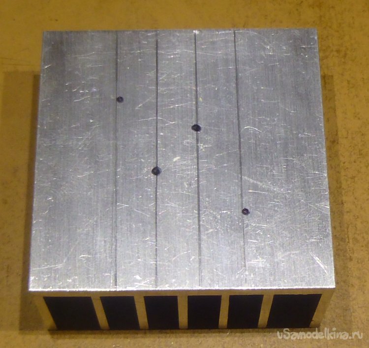Разметил центры между рёбер радиатора и по шаблону наметил отверстия.