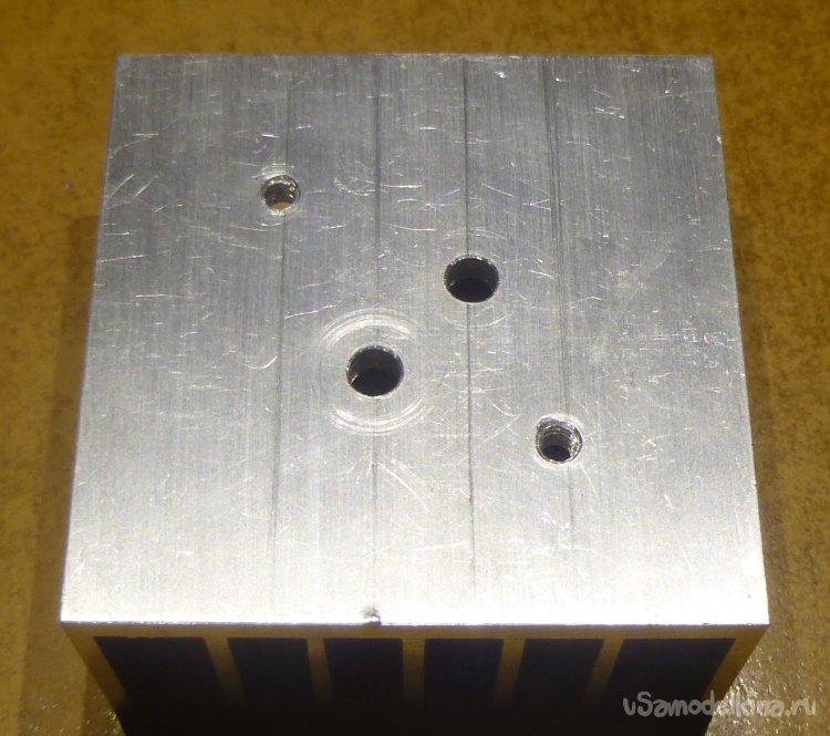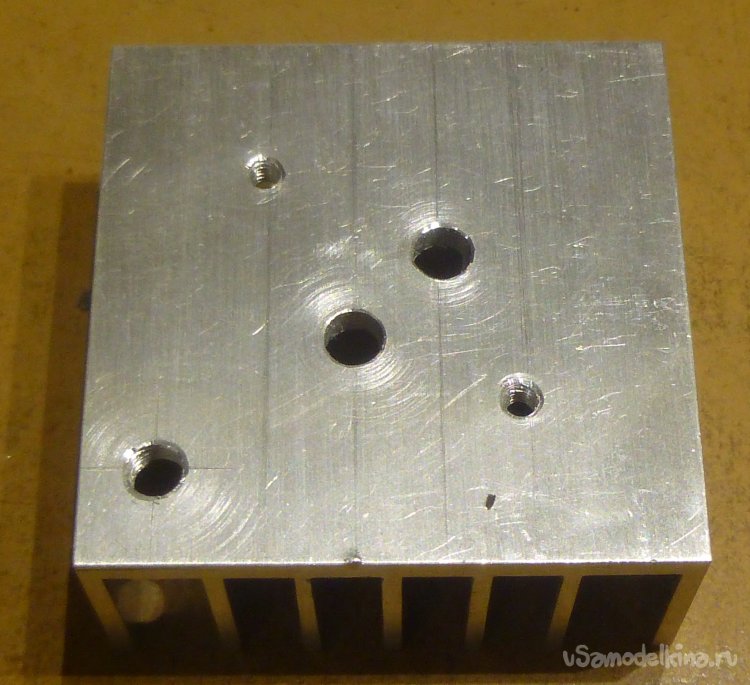 На сверлильном станке просверлил два отверстия под ножки транзистора и два под крепление. Нарезал в отверстиях для крепления резьбу М3.