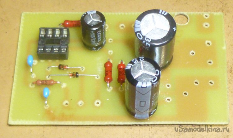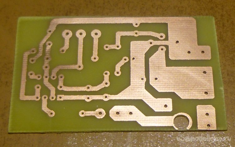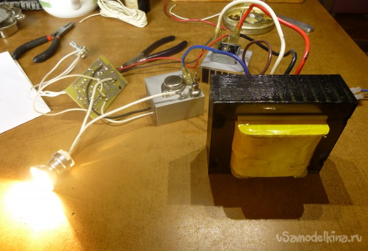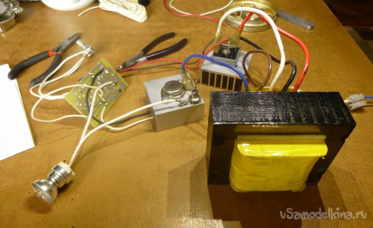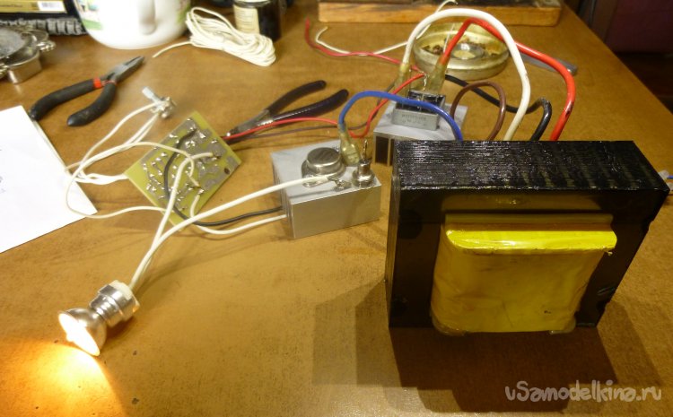 Итак, собрал макет на столе, подключил его к сети, проверил напряжение на коллекторе транзистора — “0”! Транзистор не запускается, хотя, когда крутишь ручку переменного резистора, что-то происходит. Проверил всю сборку и только тогда обнаружил злосчастный диод КД202 с перепутанными выводами! Отпаял с анода провод — на выходе тут же появилось напряжение. И чёрт меня дёрнул поставить его на радиатор вместе с транзистором?! Ведь, когда разрабатывал плату, предусмотрел для него отдельное посадочное местечко! Ну, сжечь, вроде, я ничего не мог, кроме этого диода. Проверил диод — рабочий (умели в СССР делать!). Ладно, продолжим.