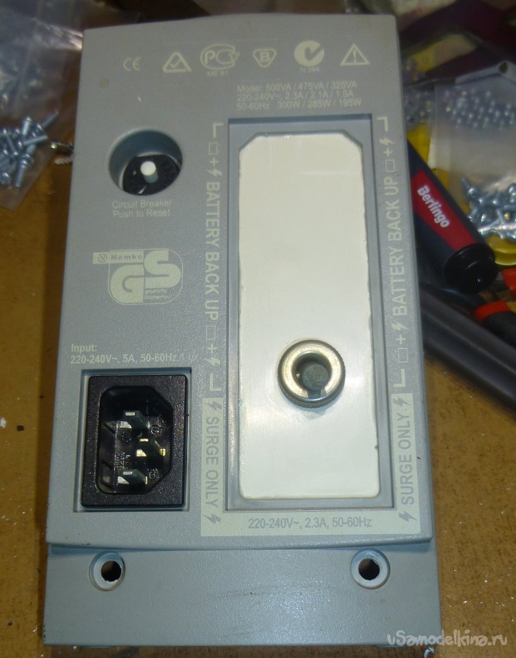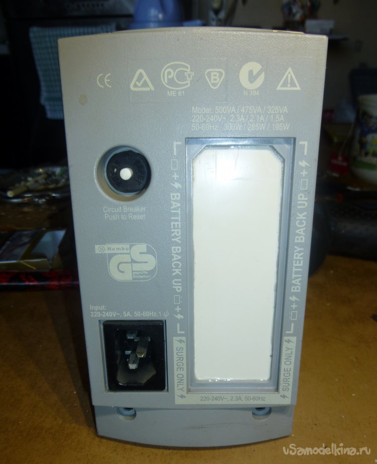 Действительно, блок питания (далее БП), который я использовал, слабоват для моторчика HRS550S-7015F. Он выдаёт не больше 1 A и сильно греется при работе станочка, плюс ещё подсветка съедает порядка 150 mA. В закромах своей квартиры, а именно, в личной гардеробной, которая постепенно превратилась в чулан (как говорит мне постоянно жена), я нашёл старый нерабочий блок бесперебойного питания (далее ИБП), от которого я использовал корпус, трансформатор и ещё кое-какие деталюшки. Но по порядку.
