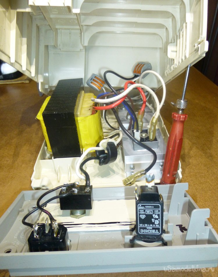 А дальше  дело техники — пайка, разводка проводов и т.п. Тут главное не ошибиться. Кое-где пришлось использовать клеммники VAGO  (по-моему, так называются) для соединения проводов. Для соединения трансформатора с диодным мостом использовал штатные клеммы, предварительно обжав их пассатижами.