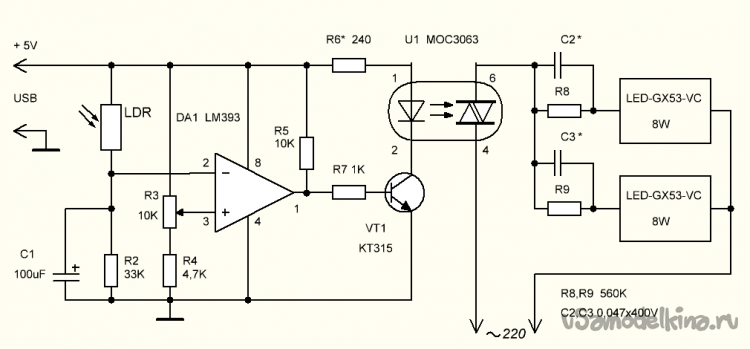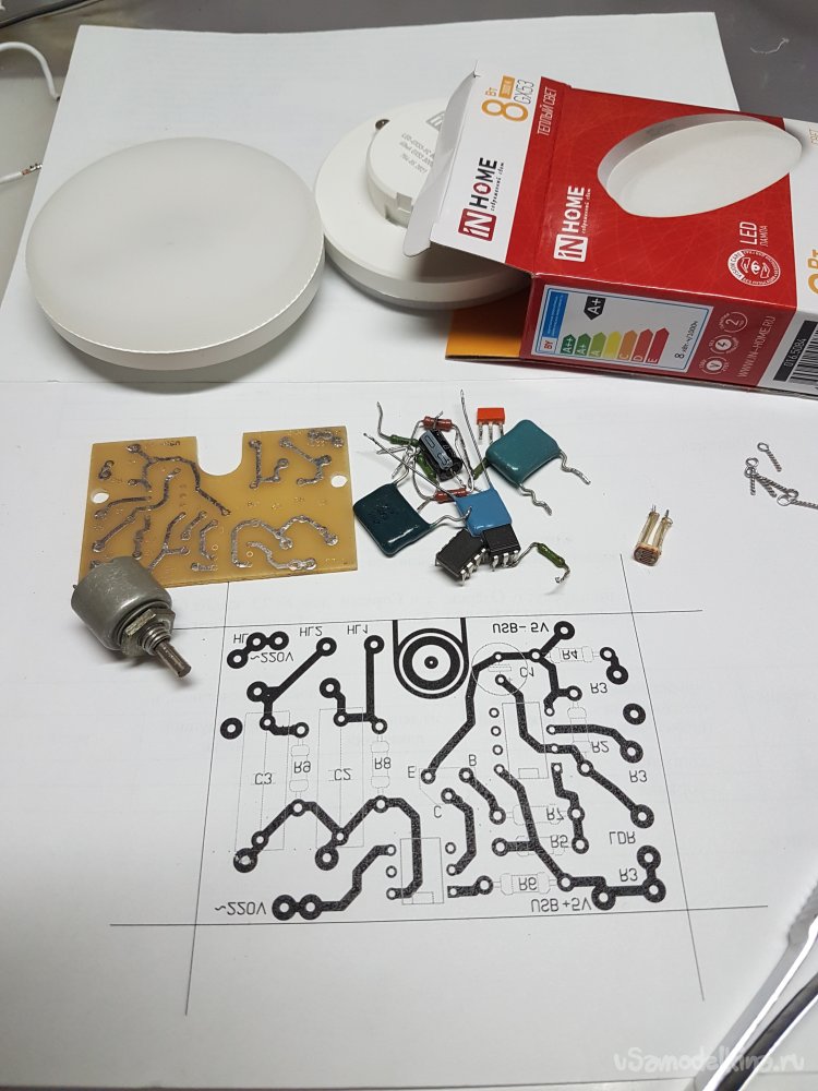 И вот я предлагаю такую версию фоновой подсветки. В качестве СД лент использую светодиодные лампы, что монтируют с натяжными потолками. Например, LED-GX53-VC 8W 3000К. Теплый свет- не такой резкий. Да и все причиндалы, необходимые для работы светодиодов (блок питания, драйверы) в них уже присутствуют. Будем собирать фотореле на LM393. Фотореле и даст подсветке возможность сообразить- день сейчас или ночь.