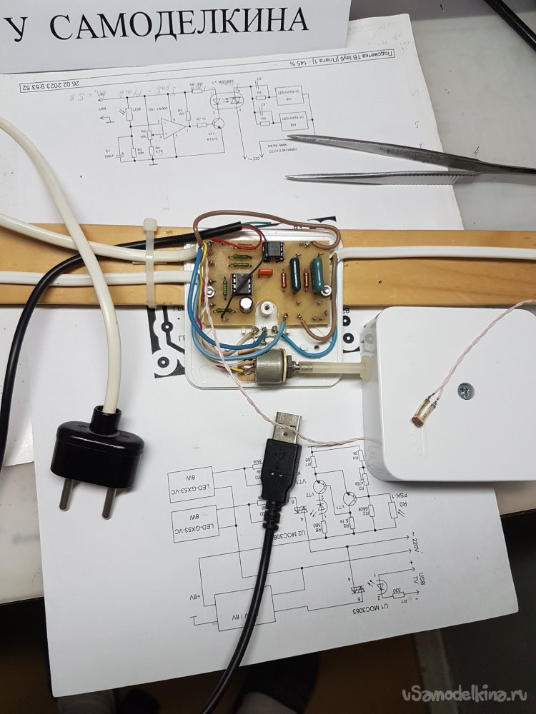 Свет, попадая на фоторезистор, изменяет его сопротивление. Соответственно изменяется напряжение на ножке 2 микросхемы и, в конечном итоге, на выходе компаратора- ножке 1. В случае, когда в комнате темно, напряжение на входе- ножке 2 уменьшается, на выходе- ножка 1 появляется положительное напряжение, которое открывает транзисторный ключ на VT1., при этом через светодиод оптопары U1 начинает протекать ток. Светодиод, зажигаясь, открывает фотосимистор оптопары и на нагрузку- СД лампы- подается напряжение. Они загораются. При освещении фоторезистора происходит обратное действие- на входе (2) компаратора напряжение становится более положительным, он отрабатывает таким образом, что на выходе (1) напряжение уменьшается настолько, что транзисторный ключ закрывается, ток через фотодиод не проходит и, соответственно, закрывается фотосимистор, отключая от сети СД лампы. Свет гаснет. Потенциометром R3, при внешнем освещении, мы выбираем точку срабатывания фотореле когда, прикрывая от света фоторезистор, загораются лампы. Резистор R4 изменяет плечо делителя, позволяя более плавно выбирать значение опорного напряжения- сравните- регулировка в треть оборота потенциометра или более половины. Любителям делать замеры: у меня на 3 ноге стабильно 1,9В, на второй ножке при освещении фоторезистора 3,3В, при затемнении (да пальцем закрыл и всё) 1,5В.
